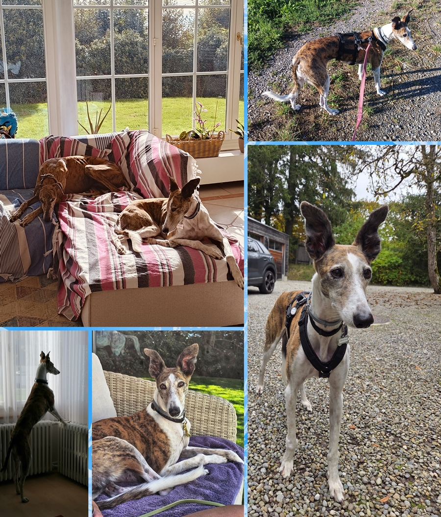 ![]() Maribel selber ist ein bisschen schüchtern im Erstkontakt mit fremden Menschen, wenn sie Vertrauen hat taut sie aber schnell auf. Sie ist mit den anderen Hunden gut verträglich, zieht aber ein eher ruhiges Umfeld vor. ![]() Falls Sie Maribel kennenlernen möchten und ihr ein passendes Zuhause geben könnten, verlangen Sie bitte unser unverbindliches Bewerbungsformular: Tel. 0041 32 462 3219 (falls Anrufbeantworter, bitte Meldung hinterlassen, wir rufen gerne zurück) oder per Mail: info@grisette.ch. Maribel ist geimpft, gechippt, kastriert und auf Mittelmeerkrankheiten getestet und wird bei der Einreise durch uns verzollt. Sie wird mit Schutzvertrag gegen eine Schutzgebühr von SFr. 600.-- nach vorheriger Platzvorkontrolle vermittelt. 25. September 2023 Maribel ist angekommen : Am Samstag sind Maribel, Morena, Cachimba, und Chanel gut im Jura angekommen. Auch Maribel ist wie Morena ca 62 cm gross und zeigt sich bisher sehr freundlich und aufgeschlossen. Wir werden in Kürze noch einen Termin beim Tierarzt machen. Maribels rechtes Handgelenk ist verdickt. Gem. spanischer Tierärztin handelt es sich dabei um einen alten Bruch, bei dem man nichts mehr machen könne. Wir werden aber sicherheitshalber mal röntgen lassen. ![]() ![]() 01. Dezember 2023 Maribel zog auf eine Pflegestelle : Vor einigen Wochen zog Maribel auf eine Pflegestelle im Thurgau. Hier der erste Bericht von dort: 08.11.23: Maribel - eine ganz besondere Galga mit Fledermausohren Maribels Geschichte geht ans Herz, denn sie wurde von ihrem Jäger hochträchtig abgegeben. In Spanien gebar sie 7 Welpen, welche liebevoll von ihr mit Hilfe von La Casa de Tony aufgezogen wurden. Die 7 Zwerge fanden alle ein Zuhause, nur Maribel sucht noch ihr für immer Daheim. Seit kurzem ist die hübsche Maribel bei uns auf Pflegestelle eingezogen und zeigt sich Zuhause als pflegeleichte verschmuste Galga. Sie kennt das Leben im Haus bereits von der spanischen Pflegestelle. Maribel ist stubenrein und passt sich dem Alltag problemlos an. Zu mir hat sie schnell Vertrauen aufgebaut und ist innert kurzer Zeit mein 2ter Schatten. Stefan, der Herr des Hauses, ist nach rund 1er Woche als "gefahrlos" eingestuft und Maribel mag nun auch zu ihm Kontakt aufnehmen. Ihr Fell ist dicht und seidenweich. Ihre Ohren sind ihr spezielles Markenzeichen, denn sie trägt diese gerne auch aufgestellt, was perfekt zu ihrem fröhlichen Wesen passt. ![]() Unterwegs zeigt Maribel ihre grosse Jagdpassion. Sie läuft an der Spitze der Hundegruppe und scannt die Umgebung nach Bewegungen ab. Somit würde ich momentan ein Zusammenleben mit Katze und kleinem Hund eher ausschliessen. Aktuell lernt Maribel, dass das Beachten von mir am Leinenende auch Vorzüge mit sich bringt und fremde Hundebegegnungen zum Spaziergang dazugehören. Hierbei ist die routinierte Hundegruppe sehr hilfreich, denn Maribel kann so von den anderen abgucken, wie diese sich verhalten. ![]() Ihr verdicktes Sprunggelenk, vorne rechts, scheint ihr keine Probleme, Schmerzen oder Einschränkungen zu bereiten. Trotzdem ist demnächst ein Röntgentermin vereinbart. Ebenfalls ist ein Physiotermin geplant, damit wir über den "Ist-Zustand" optimal informieren können. (In der Zwischenzeit wurde geröntgt und hier die Aussage des Chirurgen: Corpus: keine OP so lange Maribel gut läuft. Es war eine Sublukation des Os carpis radiale; ist in dieser Stellung gut vernarbt/arthrotisiert. Erst bei Lahmheit empfehle ich eine Panarthrodese). 04. Januar 2024 Zwei Monate Maribel Zaubermaus Neuer Bericht von Maribels Pflegestelle: Maribel ist eine besondere Galga mit entzückendem Aussehen. Zuhause ist sie relaxed, mag Streicheleinheiten, kommt auch mal zu einem Kontaktliegen und ist genauso gerne für sich im Hundebett am dösen. ![]() Draussen ist Maribel eine Powermaus und auf Zack. Flotten Schrittes läuft sie voran. Ihr Jagdtrieb ist stark und stets aktiv. Bei Hundebegegnungen braucht sie Unterstützung. Maribel schliesst sich ihrem Menschen an, wenn sie ruhig, klar und kameradschaftlich geführt wird. In kurzer Zeit erlebe ich dadurch ein einzigartiges Miteinander, mit unglaublichem Potential. Maribel ist glücklich, wenn sie mit ihrem/n Menschen zusammen sein kann (als Einzelhund oder mit einem weiteren grossen netten Hund). In ländlicher Umgebung fühlt sie sich am wohlsten. Aufgrund ihrer Jagdpassion empfehlen wir keine Vermittlung zu Katzen oder kleinen Hunden. 28. April 2024 Maribel "ma Belle" : 08.04.2024: Maribelle ist bereits 5 Monate bei uns auf Pflegestelle. Typisch Galga wird Zuhause vorallem gefaulenzt, gekuschelt und mit der Hundegruppe friedlich zusammengelebt. Ihr Mittelpunkt ist und bleibt ihre Bezugsperson(en). Maribel hat inzwischen gelernt, unterwegs das vorgegebene Tempo an mir und der Hundegruppe anzupassen. So gehts mal flotten Schrittes voran, mal eher gemütlich schlendernd oder gar stehend beim Grashalme knabbern. Das Scannen der Umgebung ist viel weniger geworden. Mir scheint, sie ist deutlich entspannter unterwegs und geniesst nun die Spaziergänge. Bei Hundebegegnungen gehen wir gemeinsam vorbei und Maribel nimmt diese Unterstützung an, beinahe froh die Verantwortung abgeben zu können. An Passanten, Fahrradfahrern, Familien mit Kindern und dem Strassenverkehr geht sie neutral vorbei. Unterwegs mit Maribel (movie) Unterwegs mit Maribel Vol 2 (movie) Besuch im Einkaufszentrum (movie) Morgengymnastik (movie) ![]() Für Maribel suchen wir Mensch/en mit Hundewissen, denn sie braucht jemanden, der sie kameradschaftlich unterstützt und so ein verlässlicher Begleiter ist. Zum perfekten Glück fehlt nur noch ihr eigenes Zuhause bei ihrem Menschen für immer. 27. Oktober 2024 Zeit für ein eigenes Zuhause bitte: Nun ist es schon fast ein Jahr her, seit Maribel auf der Pflegestelle ist. Sie ist dank der tollen Arbeit der Pflegestelle schon lange bereit für ihr eigenes neues Zuhause. Wir sind wirklich erstaunt, dass sie nicht schon längst umgezogen ist. Und ja, wir wären auch sehr dankbar,
