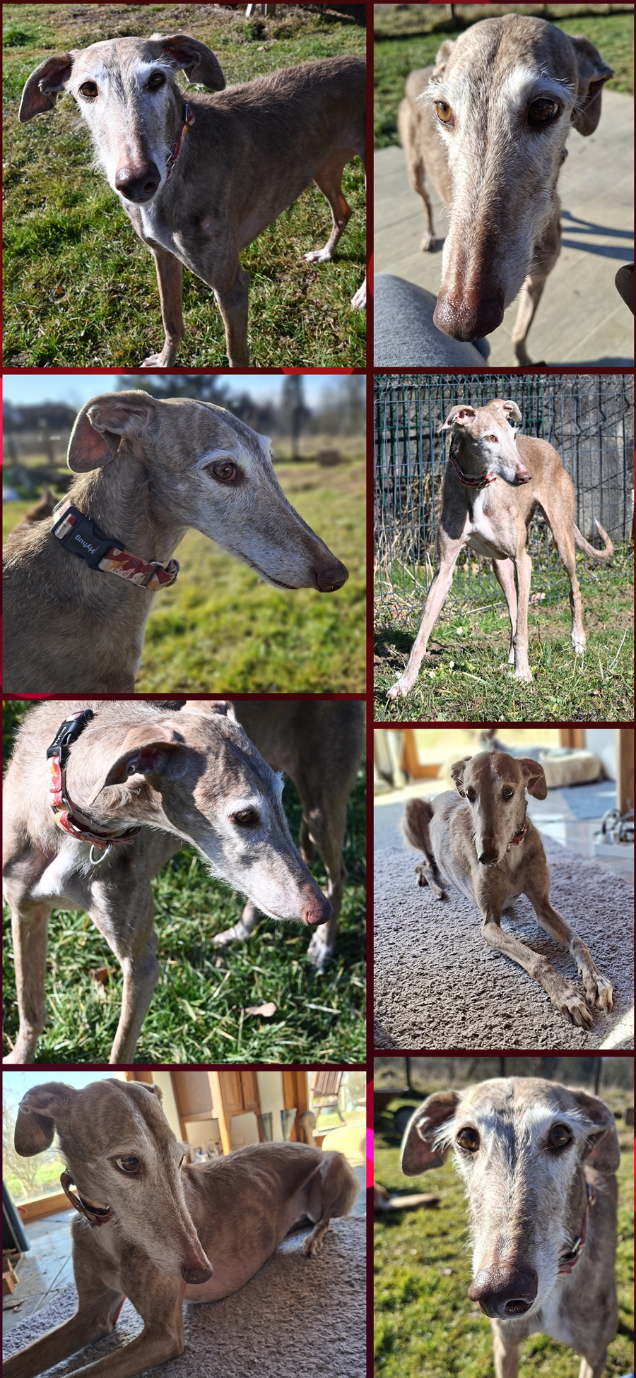 Wir wissen noch nicht, wie teuer die OP kommen wird, halten euch natürlich aber auf dem Laufenden. Und noch was gibt es zu berichten: wir haben Kontakt zu einer sehr netten Familie aus dem Fricktal. Diese Familie hat vor ein paar Jahren einen Hund aufgenommen, der durch einen Autounfall ähnliche Probleme hatte wie Rita. Sein Name ist Leo. Und vor kurzem ist Leos Gschpänli altershalber verstorben und es ist ein Plätzli frei geworden. Rita und ich machen uns nun schon bald auf den Weg, um die Familie persönlich kennenzulernen. Wer weiss, was sich daraus ergibt 08. Februar 2020 Sehr gute News von Rita : In der Zwischenzeit haben wir Rita unserem Chirurgen, TA Beck von der Klinik Aarau-West vorgestellt. Es wurden neue Röntgenbilder gemacht und das Gangbild von Rita angeschaut. Und Rita muss nicht operiert werden, hier der Bericht von TA Beck: " Rita läuft erstaunlich gut und scheint schmerzfrei zu sein. Die Beweglichkeit ist etwa 80% (Extension Hüftgelenk). Die multiplen Beckenfrakturen links ( Ileum, Acetabulum + Ischium) scheinen schon verwachsen zu sein. Eine Operation dürfte kaum ein besseres Resultat bringen. Ich würde den weiteren Verlauf beobachten und die klinischen Zeichen für eine Reevaluation nutzen. Freundliche Grüsse Dr. P. Beck". Und nach dem Besuch bei TA Beck durfte ich Rita gleich in ihr neues Zuhause bringen. Dies wäre auch der Fall gewesen, wäre Rita operiert worden und ich finde es ganz toll dass es Menschen gibt, die auch "so einem" Hund eine Chance geben. Übrigens ist Rita eine ganz wunderbare und sympathische Hündin, aber ich glaube so was in der Art habe ich bereits erwähnt Wir bedanken uns noch bei folgenden Spender: Ursula F. und Vero und die Windhundgruppe 21. März 2020 Rita is doing great : I have sent you pictures, hope you like them. She is doing great and she and Leo are so happy together. They play fetch and run in the yard! It is great for her to burn off the extra energy. We were very careful when she was in heat and is now on a regular walk schedule with Leo. She knows how to sit, stay, come, wait and drop. It is so easy to teach her because of Leo and she loves to learn. She is a sweet, wonderful dog and we are so happy to have her. She also identifies strongly with her pack and I have been home since she came which is great for everyone. She is never alone. On Saturdays we do a long walk then we go to a great little bistro in the village where she is learning to socialize. I will take a photo next time we go and I will try to get some of her and Leo in the yard! Take care of yourself. Big hugs 10. April 2020 Like watching a flower bloom : 21.03.20: We love the pup so much and she loves us too. It is wonderful to watch her change and grow. It is like watching a flower bloom. Both of the pups are so happy and we are too. These are difficult times so please take care of yourself. Best regards Joanne 😊 🤣 😃 27.03.20: Everyday we work with her to help her leg. Slow but steady. She loves to run and the yard is big enough for both pups to run and play. She also sleeps through the night now so she doesn't go to the washroom until she gets up. We are so lucky to have her and Leo loves her to bits. Thank goodness he is a well trained dog since as I mentioned before she learns so much from him. Take care of yourself. All the best Joanne and Rob Don't you just love it! They are both so happy!!! Have a great day 😀